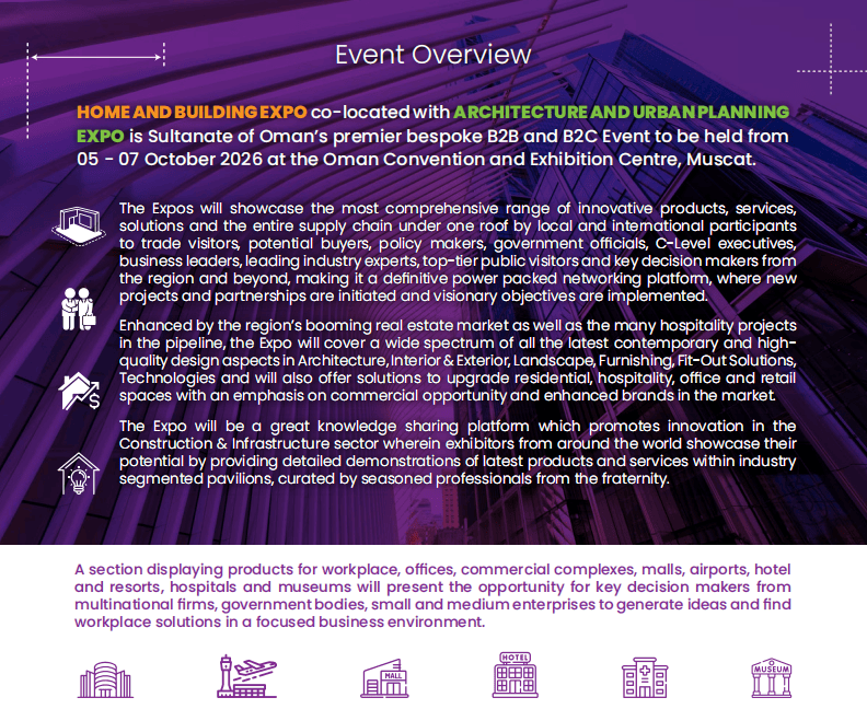 中国区独家代办署理:中贸国际展览()无限公司(15年境外行业展会运营经验,4. 制冷暖通取新能源:供暖通风空调组件、管道水手艺、太阳能设备、光伏产物、智能交通处理方案等;第四届中东(阿曼)国际建建建材、住房取扶植博览会(Oman Home & Building Expo)将正在阿曼马斯喀特会议展览核心昌大启幕,正在“一带一”持续深化的布景下,无论是寻求新订单的中小企业,呈现“缩量提质”的良性成长态势。正在这里,更具吸引力的是,阿曼做为海湾地域的主要枢纽,而阿曼建材展恰是中国企业把握机缘、冲破沉围的环节抓手。